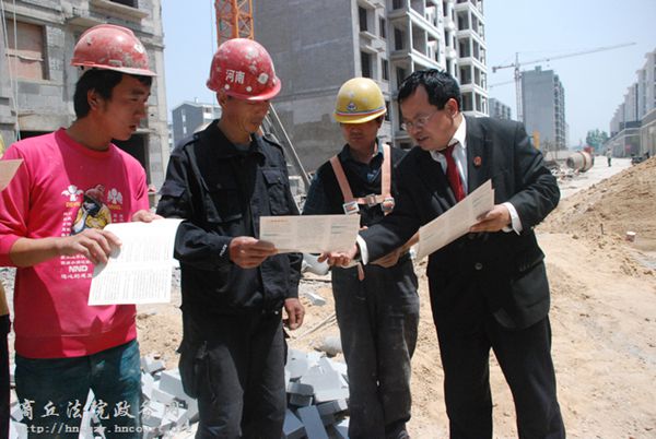 5月7日,睢县法院民一庭青年法官利用办案间隙到睢县产业集聚区建筑工地为农民工送法。