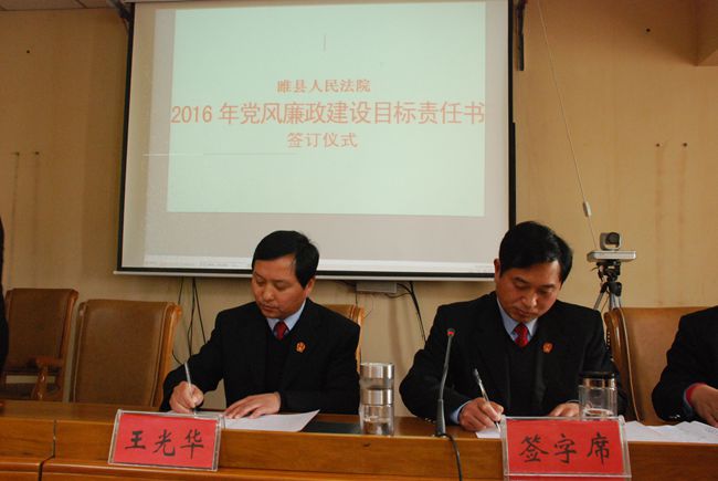 睢县法院院长王光华还和各分管副职签订了2016年党风廉政建设目标责任书,并进行了部门负责人述职。