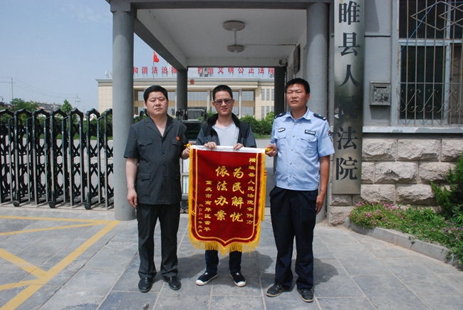 “这面锦旗是我的一片心意,请你们一定要收下,我的钱原本都觉得没有希望了,是你们的不放弃,才让案件峰回路转,真是太感谢啦!” 5月23日一大早,远在重庆的申请执行人雷某不远千里来到睢县法院,将手中书写有“依法办案,为民解忧”八个大字的锦旗交到执行干警手中,连声表示谢意。