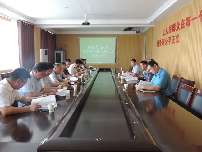7月12日上午,睢县法院召开“基本解决执行难”工作联席会议。县委政法委副书记胡卫民、法院常务副院长李文彬以及检察院、公安局等相关单位负责人参加了会议。