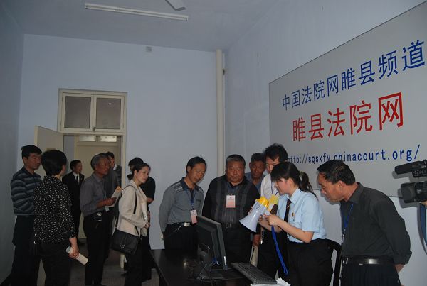 来访的人大代表、政协委员和各界群众代表在睢县法院法警讲解员白洁引导下,从上午9时开始,首先到审判大楼参观了法院数字化第二审判庭、第三少年圆桌审判庭、第四圆桌调解审判庭以及开重大案件时用的第一大审判庭,并在法院数字化审判庭观摩了睢县法院刑事庭办理的被告人崔文军非法吸收公众存款一案的开庭审理,现场体验了庄严的刑事审判法庭气氛和法官娴熟的驾驭庭审技巧。在进入审判法庭前,代表们还亲身体验了法院安检门安检,上午10时20分庭审结束后,又察看了法院信访接待室、立案大厅、执行大厅和车库。10时40分,代表们在睢县法院法官讲解员马冬丽引导下来到法院办公大楼,先后参观了该院荣誉室、网站、视频会议室、法官健身室、娱乐室和院长办公室,在网站现场搜索查阅了睢县法院今年4月份办结的部分案件的判决书,在院长办公室和睢县法院院长王养庆就法院审判公开工作进行了面对面的交流,两名网民代表还现场邀请王养庆院长给予了签名留念。