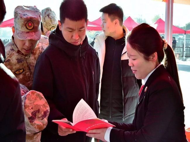 12月3日,在第十二个“国家宪法日”来临之际,睢县人民法院组织干警走进恒山湖双拥文化广场,全程参与由县退役军人事务局、县人力资源和社会保障局联合主办的“戎耀襄邑 职引未来”退役军人专场招聘会,通过“普法+服务”模式,为退役军人及家属送上法律服务,以法治力量护航退役军人就业创业之路。