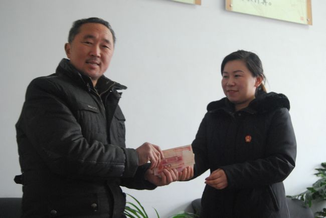 图为 2013年2月4日,法院干警将慰问金送到困难当事人手
